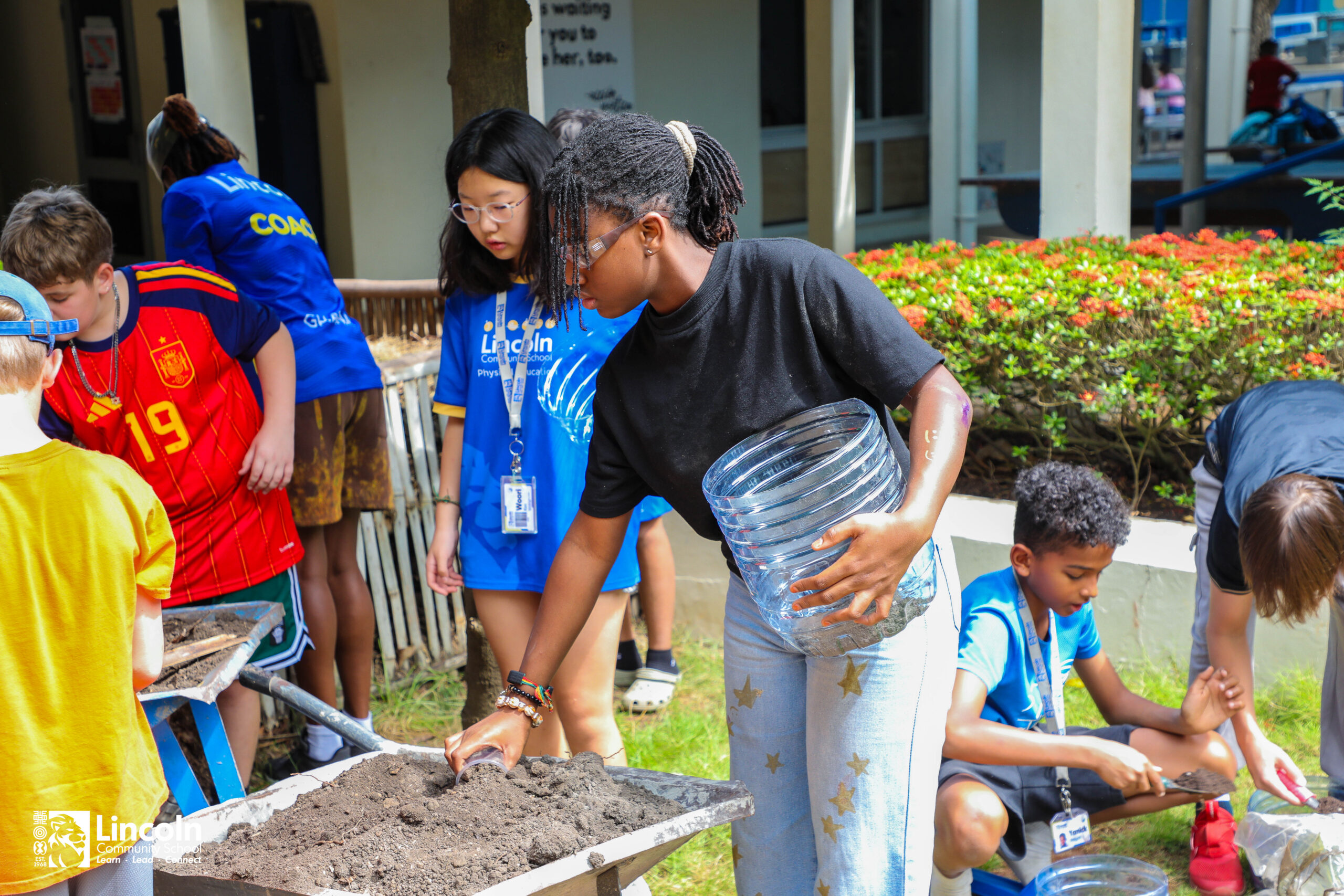 Our students, with the help of the LCS Makerspace team, were able to put some tools to use to recycle old water bottles into planting boxes. Once the recycled containers were repurposed, cut to size, and drilled for drainage, it was time to head to the compost heap. Here, the students learnt to mix nutrient-dense compost with fertile soil and potting soil, offering the seedlings the perfect conditions to thrive under the Ghanaian sun.